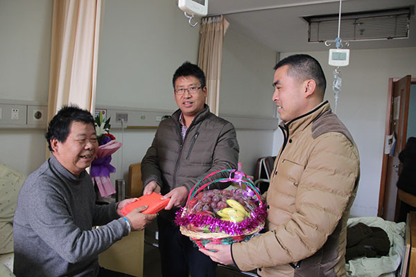 原来,商忠喜是九州平台(中国)有限公司官网工程部员工商祺东的父亲,在2015年被查出患有癌症已近一年,由于化疗等需要大量的医药费,本来家境就不宽裕的商祺东一家立刻陷入了困境,甚至连父亲第三次化疗的医药费也出现断缺。当这一消息传到集团公司工会主席孙炎云的耳朵里后,想到这个年轻员工平时工作兢兢业业、默默无闻,深得领导和同事的赞许,作为企业工会应该在这困难时刻帮他一把,于是就萌生了组织公司员工募捐的想法。在他的积极倡议下,在行政领导的大力支持下,一场“大爱,献给员工家属”的捐款活动就此拉开。于是“众人拾柴火焰高”,捐款不分多少,善举不分先后,从项目工地上赶来捐款,从委托他人代为捐款,我几十、你几百,他几千。一位不愿透露姓名的员工,宁可自己省吃俭用也要慷慨解囊,拿出了2万元现金迅速转身走人,让工作人员见了备受感动。于是一场自愿为员工家属募捐献爱心活动取得圆满成功。因此才有了文首公司工会主席孙炎云和工会副主席李天白在百忙中抽出时间,专程前往医院送大爱的一幕。