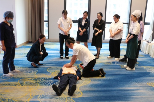 戴亚琴护士长针对常见的紧急情况以及结合酒店行业特点,首先讲解了常见的糖尿病、晕厥、老年人心梗、如何搬运等急救知识,并结合多年急救临床经验,重点讲解了气道异物梗阻(海姆立克法)、心肺复苏等关键技能,并利用人体模型分步演示胸外按压深度、频率及自动体外除颤器(AED)的正确操作流程。通过模拟教具,指导员工分批演练,员工在一定程度上掌握相关的急救知识。在培训过程中,戴亚琴护士长不仅详细阐述了各项急救技能的理论知识,还强调了在实际操作中可能遇到的问题和应对策略,与员工积极互动。员工们积极响应,纷纷表示这样的培训非常实用,能够让他们在面对突发情况时更加冷静、自信,有效地采取急救措施。