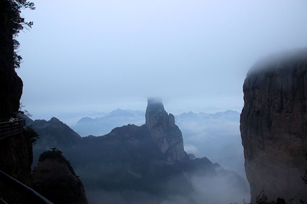 终于到了山顶,大家的眼前出现了这样一幅画面:在那波澜壮阔的群山旁围绕着变幻莫测的云海,那如梦似幻的雾气,像极了那些神话故事中神仙们居住的地方。于是大家无一不被眼前的美景所吸引,纷纷扎进雨幕中拍照、录像,感慨着眼前的一切真是太美妙、太神奇、太真实了。大家忘情地观赏着、想象着,任雨淋、任风吹、任雾侵。在雨雾中的神仙居里留下自己的身影,带走这独特的胜景。