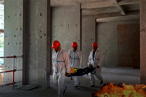 “着火啦!着火啦!”在防火应急演练现场,项目安全负责人在接到现场安全巡查人员报告后,立即将现场情况上报至集团公司分管领导,同时启动应急救援预案。随后疏散警戒组、消防灭火组、医疗救护组、通信联络组等组成的应急救援队迅速赶到,疏散被困人员、解救伤员、灭火,各应急小组分工明确,忙而不乱。
