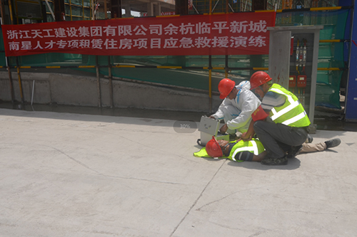 在用电安全应急演习现场,现场安全巡视人员用洪亮急促的声音汇报着现场情况,“14号楼门口发生触电事故……”,随后就近的项目电工和医护救援人员迅速赶到,切断主电源,心肺复苏,有条不紊地开展着抢救工作。