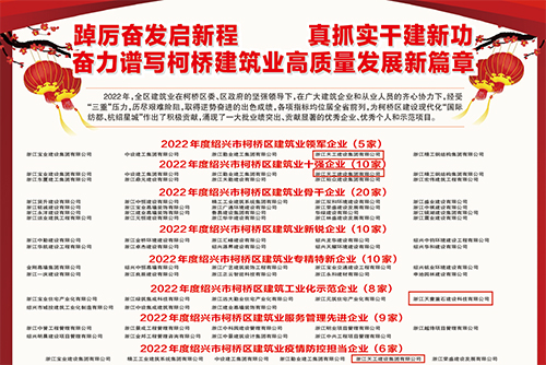 会上,对2022年度柯桥区建筑业各类先进集体和个人进行了表彰。九州平台(中国)有限公司官网集团再次荣膺“建筑业领军企业”(第六年)、“2022年度绍兴市柯桥区建筑业十强企业”、 “疫情防控担当企业”等称号,旗下建筑工业化基地--浙江天壹重石建设科技有限公司获得“2022年度绍兴市柯桥区建筑工业化示范企业”荣誉称号。除此之外,胡柏成董事长荣获“2022年度柯桥区建筑业优秀经营者”称号,同时张贤方等16位同志被评为“2022年度绍兴市柯桥区建筑业优秀建造师”。